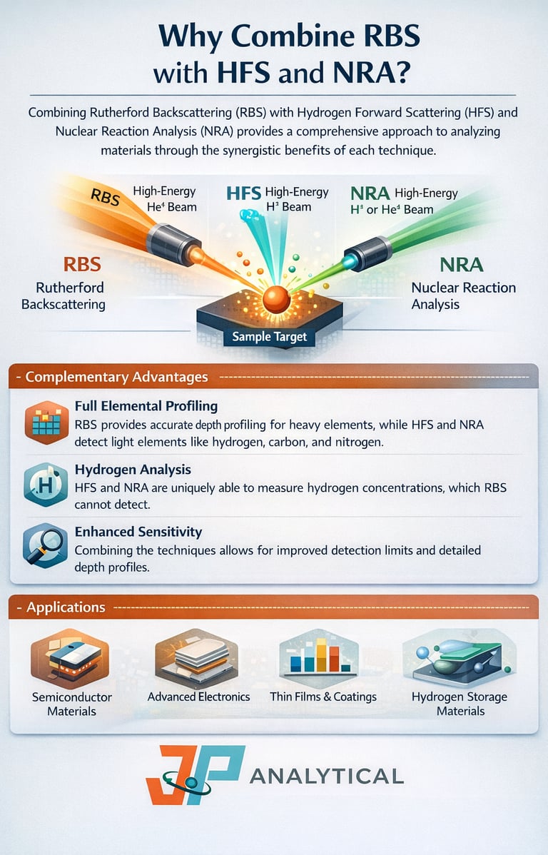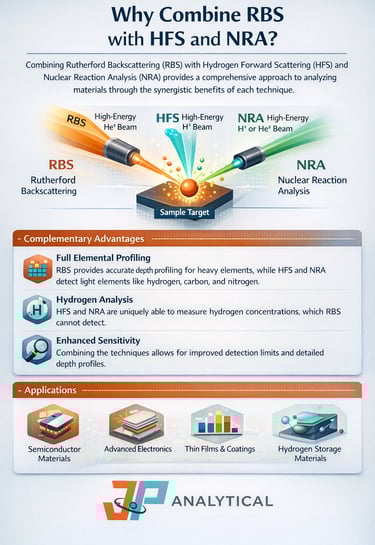 Modern thin-film materials often rely on both heavy-element precision and light-element control to achieve optimal device performance. While Rutherford Backscattering Spectrometry (RBS) delivers absolute quantification of composition, thickness, and density, Hydrogen Forward Scattering (HFS) uniquely reveals hydrogen and other low-Z elements that are invisible or difficult to measure with conventional methods. Combining these two complementary techniques provides a more complete and reliable understanding of complex material systems.