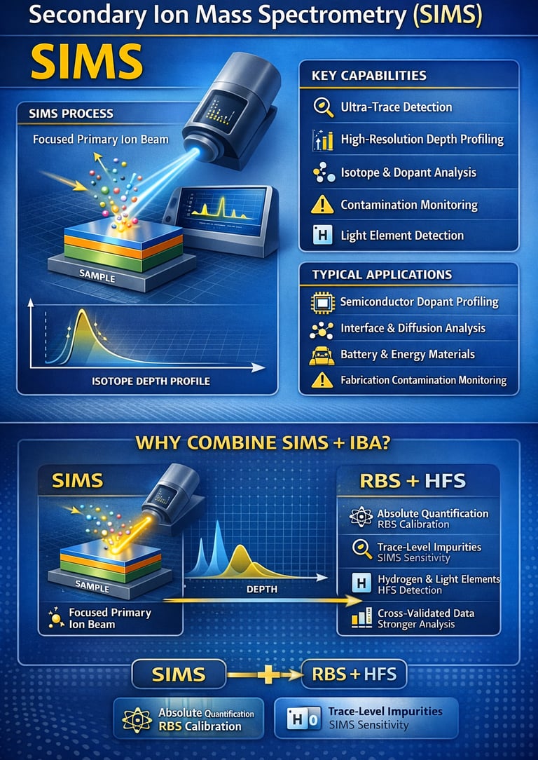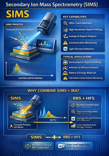 While SIMS offers unparalleled sensitivity, combining it with techniques such as RBS and HFS strengthens quantitative confidence. RBS provides absolute composition and thickness calibration, while SIMS reveals trace-level impurities and fine depth features — together delivering a more complete materials picture for advanced R&D and failure analysis.