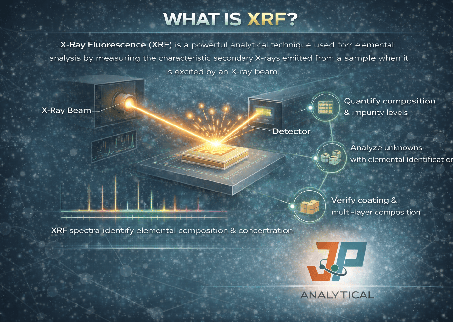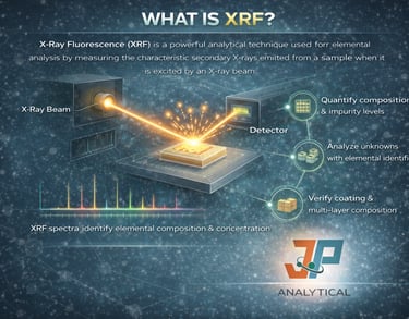 JP Analytical offers X-Ray Fluorescence (XRF) as part of our integrated metrology services, providing rapid, non-destructive elemental composition and impurity analysis across a wide range of materials. By measuring characteristic X-rays emitted from a sample under excitation, XRF enables reliable identification and quantification of elements from trace levels to bulk concentrations.
